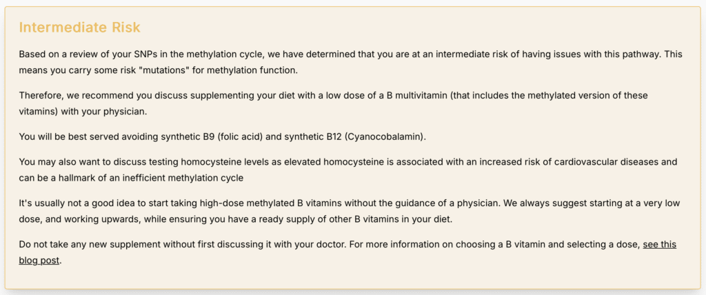 Well, a deeper dive into my methylation pathways reveals a potential answer. While my overall MTHFR enzyme function is strong, my methylation score flags as “elevated risk” based on the 15 SNPs we look at in the Gene Food Methylation Panel.